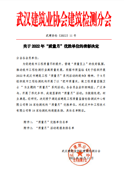 近日,武汉建筑业协会建筑检测分会发布《关于 2022 年“质量月”优胜单位的表彰决定》,我公司在本次评选中荣获“质量月”优胜单位。