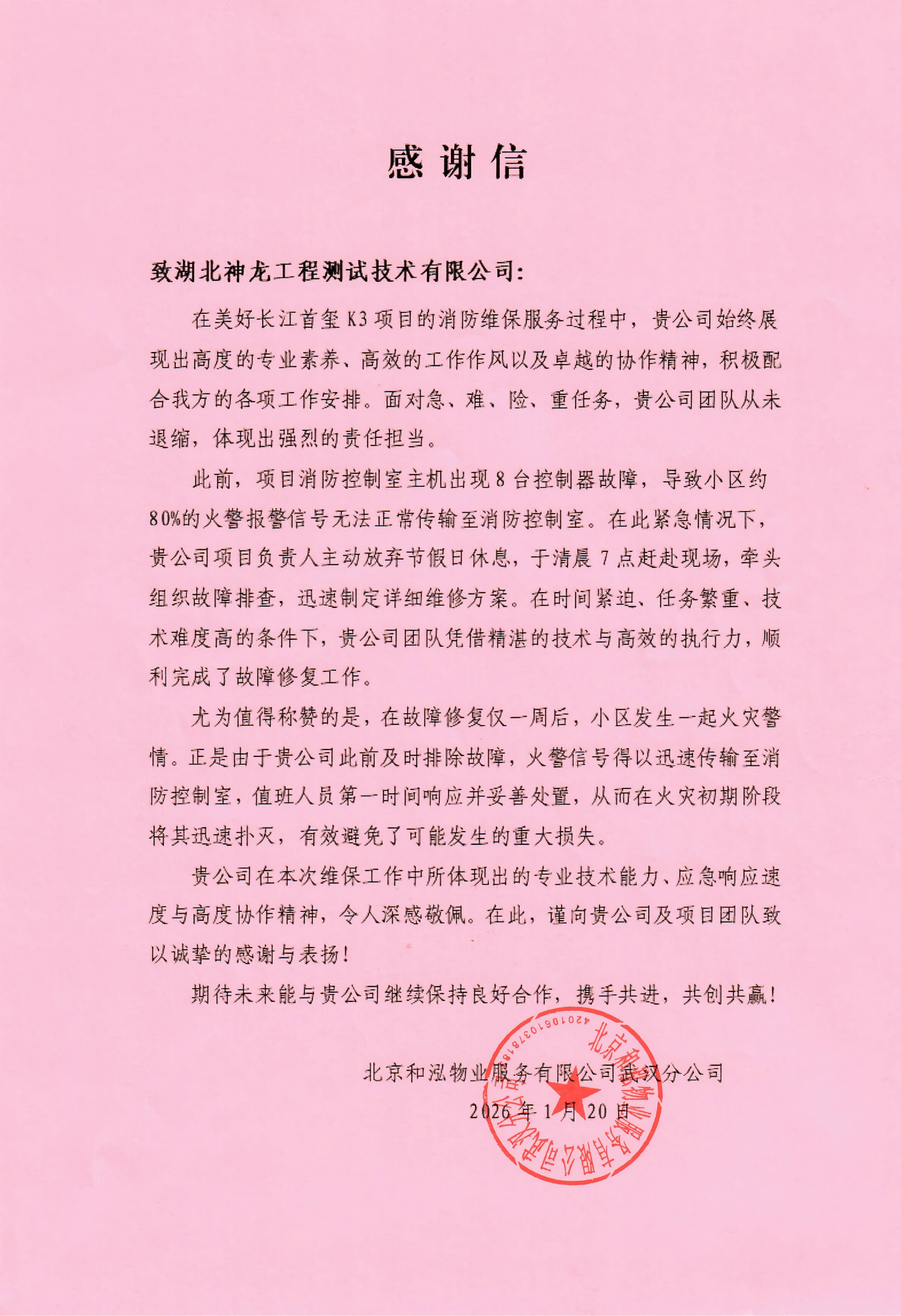 近日,我们收到北京和泓物业服务有限公司武汉分公司发来的感谢信,对我司在美好长江首玺K3项目消防维保工作中展现的专业能力和高效服务给予高度认可。
